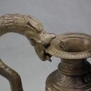 The lamp features a fuel storage pitcher with a dragon-shaped handle crafted from several elements of bronze, hand-forged, repoussé, engraved, soldered, riveted, and hinged together.
