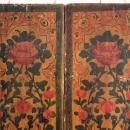 Or Best OfferThese are antique Islamic Indo-Persian wooden shutters from the 19th century, Qajar period. They are painted with polychrome gul-o-bulbul (roses and nightingales) designs. The front of these rectangular-shaped shutters is decorated with urns holding a bouquet of roses and a pair of birds perching on the branches, all finely hand-painted. On the other side, a central cartouche of typical Islamic form is surrounded by roses and nightingales, flower sprays, and foliage within a large lobed medallion, all finely hand-painted.