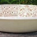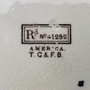 "America" pattern saucer with well ring, made by Thomas G. & Frederick Booth of Staffordshire, England. Registry date of 1886, #41252. Beautifully ornate design in brown transfer. Several marks on back. Measures 5 3/4"d x 1"h. Good condition with only minor rim imperfections, no large chips or cracks. Sold as is. Have 2, priced separately, but happy to combine shipping. Just contact me before ordering. See our other listings in this pattern! Inglenook Antiques...Established 1989.