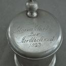 The stein lid is engraved with the inscription: "Die PilgrimSchaft Derd Der Sterblichkeit," along with the date 1823. The stein is marked underneath with the maker's and the town's touchmark. Additionally, the bottom of the stein is marked with an acquisition number from the museum.