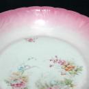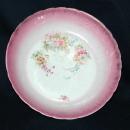Very pretty German Porcelain Bowl. It measures 9.25" across the top in diameter and 2.25 high. Has delicately hand painted roses and carnations, pink bordering over graceful raised fans and scrolls that blends into the white like shading with gold speckled trim. The rim is scalloped. The condition is very good with the only issue being wear to the gold trim.