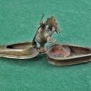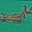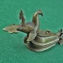 Antique Indian brass cosmetic container Peacock Sindoordani. Circa 1900 A.D. North-western India. Jodhpur .The containeris made from several elements whimsically adorned with three peacocks and divided into two yoni-shaped compartments. The top section forms a lid and pivots on a pin at the base of a large peacock. The top compartment is secured by the pressure of the beak of the small peacock.