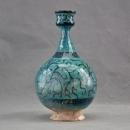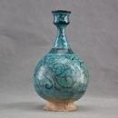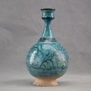 Antique Islamic medieval Seljuk Empire, c. 1037–1194 AD, (428 -590 AH). Kashan turquoise glazed pottery flask of bulbous form, resting on a short flaring foot and rising to a tapering neck with a trumpet-shaped mouth.