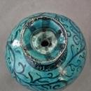 The piece is painted in black underglaze on a turquoise background, featuring vegetal scrolls. The shoulder is adorned with a band of reserved naskh Arabic calligraphic inscriptions, while the lower part of the body also displays a band of slightly visible naskh Arabic calligraphic inscriptions.