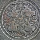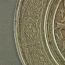 Superb quality antique 19th century Middle Eastern ,Islamic Tinned Copper plate made of very well hand hammered thick copper, embossed and finely hand chased in low relief with Hunting Scene, depicting four young aristocrat huntsmen on horseback, dressed in a splendid and armed with bow ,lance and shamshir sword a hunt various, animals. Border with broad rim engraved with 16 lobed medallions. The back is installed, with a loop for hanging the plate on the wall.