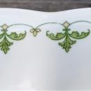 Moritz & Zdekauer Austrian porcelain relish dish in the "Carmen" pattern. Marked "Habsburg China". Green leaf border on scalloped rim, with yellow diamond-shaped accents. Circa 1900. Measures 9 1/8"l. Very nice condition with no chips or cracks. Inglenook Antiques...Established 1989.