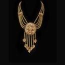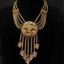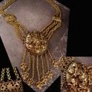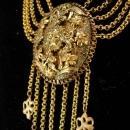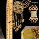This is a heavy and dramatic antique necklace that holds solid brass flower drops. The brass center piece is made in layers and when you see it in person you can see why the photos don't do it justice. You probably won't find another like it... I have seen many and this one is a real jewel. The necklace measures 16" long when closed with an additional 5 1/4" drop. The chain on this is really ornate as is the connectors ( see close ups ) The patina on this is rich and beautiful and has not been polished or cleaned. The front of this necklace has the same color consistency less the fold over clasp. The back has gold plate loss.It is a really well made and heavy necklace that has been well taken care of during its very long life. I really hope it gets a great home.. It is a real treasure.