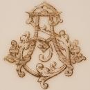 "Medaille D'Or" plate pair with peach-colored rim and gold trim, made by Pillivuyt of Paris, France. Pattern was made between 1867 and 1878. Fine porcelain. Gold crest of "A" over "S", with filligree trim. One plate measures 9"d, the other 7.25"d. Beautiful condition with no chips or cracks, very little wear. Sold as a pair. Inglenook Antiques...Established 1989.