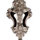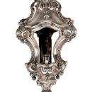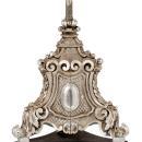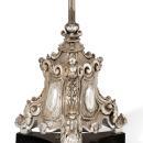 Our client's unusual torchiere in the Baroque style from Portugal dates from the mid to late nineteenth century and is crafted from silver and wood with an ebonized wooden pedestal. 87 inches tall. This three-sided open lantern with hinged door is fashioned in the neoclassical style with scroll, shell and acanthus motifs, and mounted on a pole engraved with strapwork and scrolls, mounted on a silvered base mounted on later ebonized wooden base. Poll marked in two locations with city mark for Lisbon. Attributed to Antonio Francisco Xavier da Costa. Originally fitted with glass, now missing.