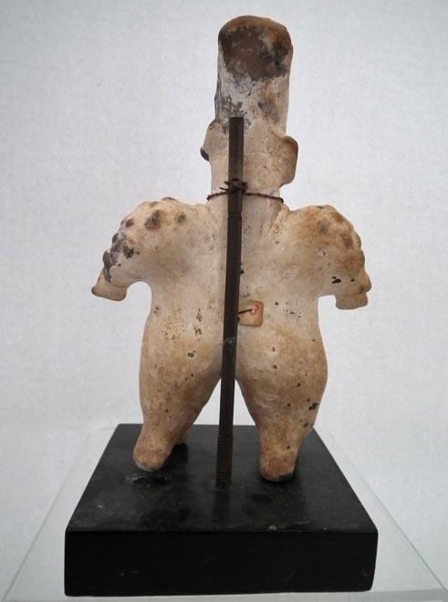 The ceramic figure is exquisitely crafted and features a female standing with curvaceous proportions. She stands on arched feet with her arms stretched outward. Her broad shoulders and ample breasts give her a commanding presence. The sculpture is decorated with a necklace made of shell pendant and painted with white buff paint.