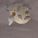 ANTIQUE SHRINER MASONIC CRESCENT STAR & SWORD HOOD ORNAMENT or car emblem. Measures 4.5 x 5.5 x .25" The condition is good but there is tarnish to the chrome. Plus there are two mounting holes on the back that look a bit mangles. One of the mounting posts has some broken prongs. It there had been any makers marks they have worn off.
