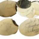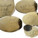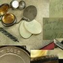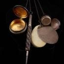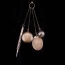 Antique sterling Chatelaine dance card compact coin holder mechanical pencil hallmarked compact. This late 1800's all original finger chatelaine has 4 pieces which include a compact, an extending mechanical pencil, a cannonball shaped coin holder and dance cards with the original names on the simulated ivory pages. It is hard to come across something that has all the original pieces, especially since it is well over 100 years old. Chatelaines were primary made to be useful, but later they became quite the fashion accessory. This one would have been taken to a dance so that gentlemen could put their name on the card and be allowed to dance with the beautiful young lady who owned this. This has the original writing with names like Samuel and Fisher along with the state they came from This also is engraved on the sterling slider case wit the initials JTS. Those same initials are on the compact ( no mirror) which lets you know that these pieces all came together. What is so neat about the coin case ( besides looking like a miniature cannon ball or musket ball, is that it would have held a dime. TO you and I, this is not a lot of money, but in the late 1800's this was worth quite a lot of money. I would imagine the woman who owned this, probably came from a prosperous family and the gentleman would have been clammering to dance and later marry her. Inside the ball coin purse it is marked sterling, an S in a shield and the number 2458. Those marks are also on the compact ( which has beautiful gold wash on the inside). The longest this measures from end to end is 9". IT has not been polished in order to keep its original patina.