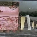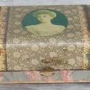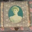 Antique Vanity Dresser Box with Lovely Lady and Roses on Lid. Inside has a Mirror on the Lid, Pick Satin Interior with Brush, Comb, Shoe Horn, Small Lidded Container and Nail Buffer. Box is 11" long, 6" deep and 3" high. Good condition, box does wear.