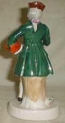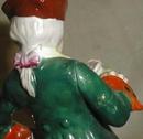 Occupied Japan Male holding flowers GREEN. This is marked on the bottom, Handpainted Made in Occupied Japan in red. It is a man figurine holding flowers. He is 8" x 3 1/2 w at base. He has had his arm repaired above the elbow, see photo, it has been glued. It is in very good condition. He has a green coat over tan and striped pants, his vest is white with gold trim and blue and red accents.
