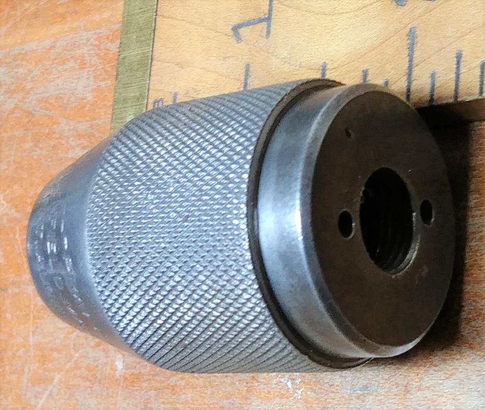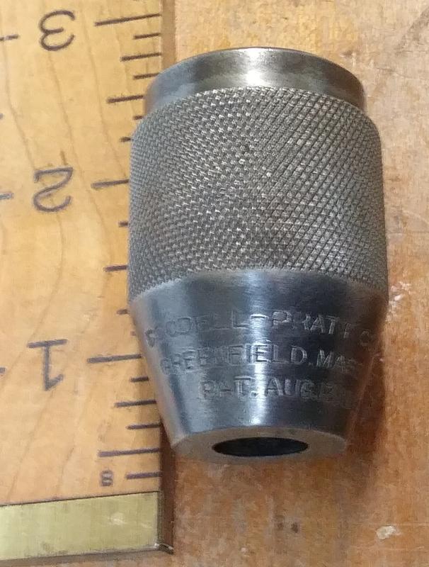 This is a good quality made 3/8" capacity antique 3-jaw chuck for Goodell-Pratt medium size hand drills. This chuck is marked "GOODELL PRATT GREENFIELD MASS. PAT. AUG.13.1895" on the end tapered surface. The threaded center hole that fits the hand drill is 7/16" or .44" diameter. Please ask about sizes you need to fit your hand-drill before you order. This chuck has good return springs, good jaws and is in very good working order overall. The chuck is 1.75" long overall.