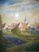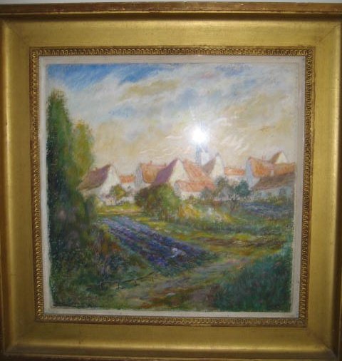 Oil on canvas by Alfred Zwiebel [German / American], "Impressionistic French Rural Scene". Zweibel exhibited in Europe and The United States in the 1930s through 1960s. This work, with its vibrant colors, appears like a pastel, but in truth, it's done in oils. This work was executed circa 1940. Dimensions: 24" x 24" framed.