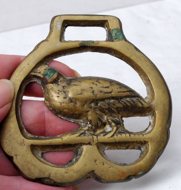 Old Horse Brass with an interest Pheasant. The tarnish is in the right place to make it look like the bird's eye. The condition is good but it is a bit rustic.