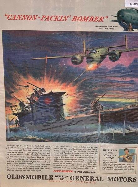 Oldsmobile Division Of GM 1944 Ad. This color May 2, 1944 ad states Cannon Packing Bomber. Firepower is our Business. Help keep the flying 75s flying. Picture shows B 25 Plane firning 75mm cannon at Submarine. Magazine tear sheet picture is taken through plastic and may show wrinkles or crookedness that is not in the ad. This original magazine tear sheet measures 10 inches wide by 13 1/4 inches tall.