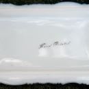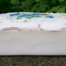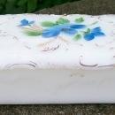 Opal glass covered box, with blue flowers and green leaves. Gold trim shows some wear. Often known as milk glass, this piece shows good "fire" around the thinner edge when held to the light. Marked "Hand Painted" inside lid. Measures 3" x 5" x 1.75"h. May have been used as a soap box for the wash stand. Circa 1900. No chips or cracks. Inglenook Antiques...Established 1989.