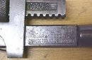 This is a Stillson style wrench with the "ONTARIO GUARENTEED BY OSWEGO TOOL CO. OSWEGO N.Y.". This one is in good+ useable condition with the black painted wood handle, that is very solid with some paint wear and a good strong ferrule and end nut. The jaws are in good used condition with good teeth, some minor wear. A very hard to find 8" long pipe wrench, by an rarely seen maker!