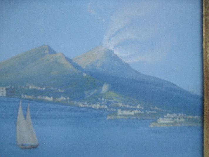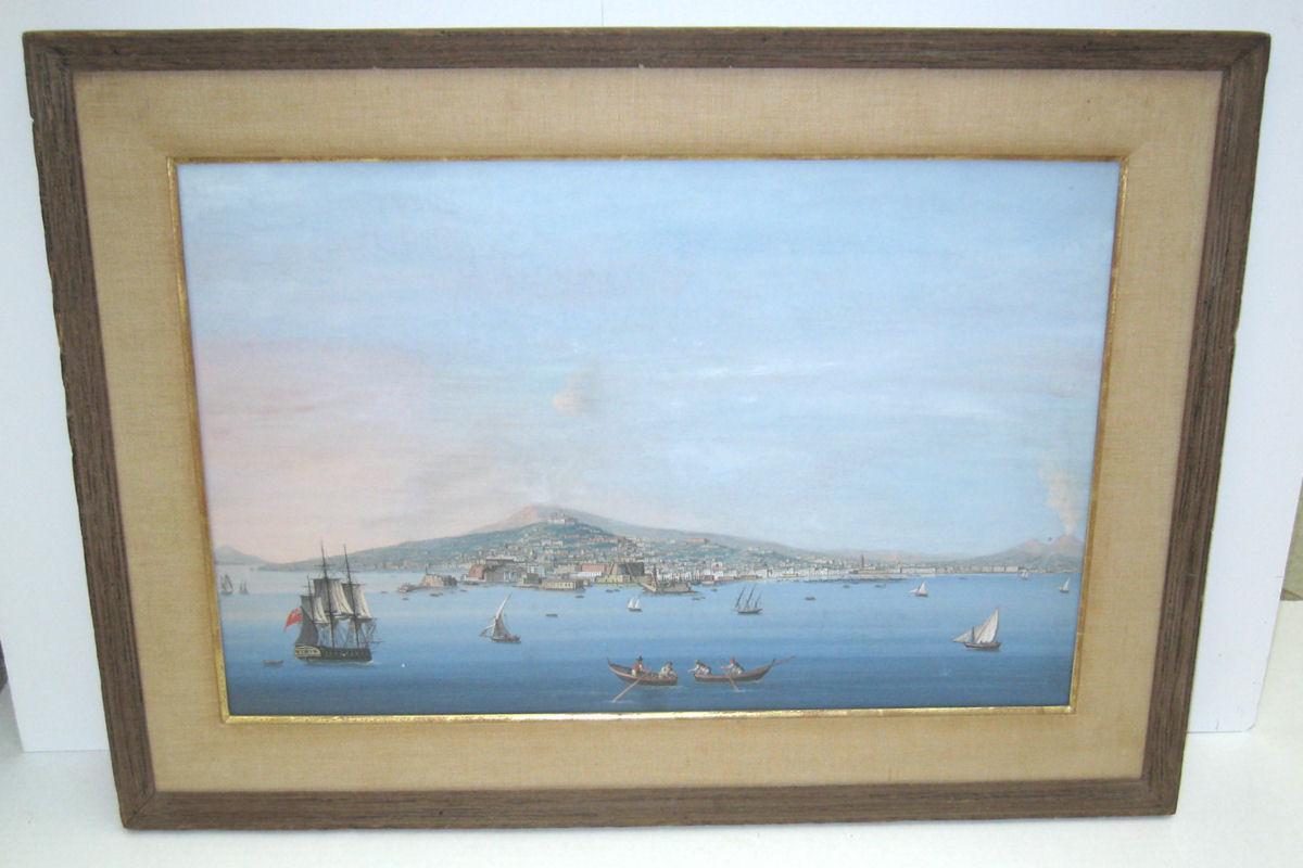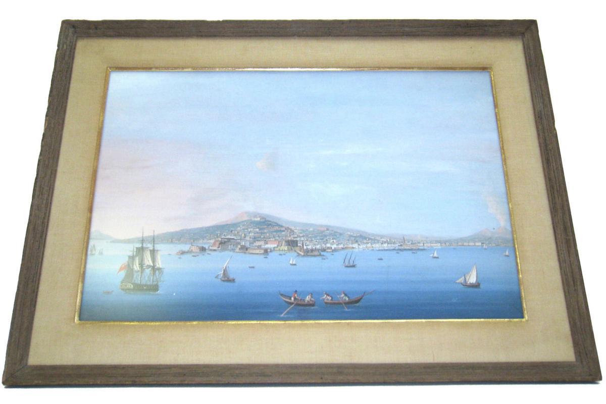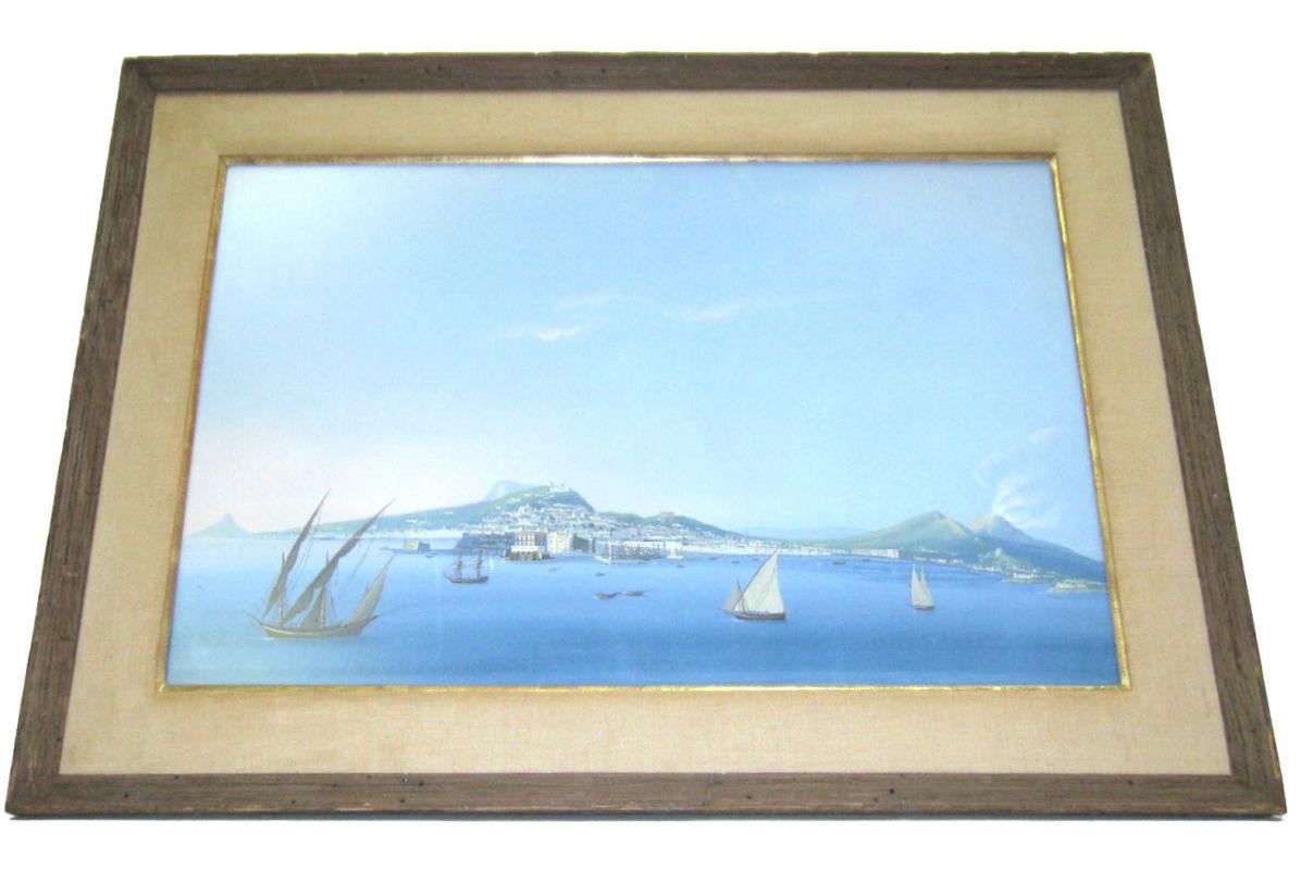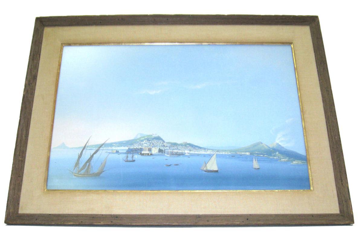 Included here are a magnificent pair of early nineteenth century gouache paintings depicting the city of Naples. Glazed frames measure 22 x 30.5 x 1.5 in (55.9 x 77.5 cm) and the paintings measure approximately 15.5 x 24 in (39.4 x 45.7 cm). Frames appear to date from the early to mid 20th century and have some wear, including scratches, nicks, chip losses. We have not dismantled the frames to inspect the paintings and are selling the pair as-is. Condition of each is good. The paintings are flat, with no visible tears or signs of restoration. There is a light, vertical scratch on one painting that can be seen in one of our images. Neither are signed. Additional images forwarded upon request.