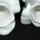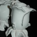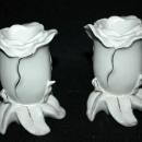 Pair of Candle Sticks, Rose with Gold Trim by Lenox , Vintage that are 3.25" tall. They are rose bud that are perched on 5 leaves that more less hide the foot. The condition is very good. Some of the 22K gold leaf trim has worn off especially towards the base.