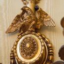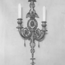 Our beautiful pair of wall appliques in the English Regency style feature long stems decorated with bellflowers, rosettes, anthemions, rosettes, spread-wing eagles and feather plumes, and is attributed to Edward F. Caldwell, widely considered to be the most important and influential designers and producers of fine lighting in the late 19th and early 20th century in the U.S. Measures 29.5" tall and 10.4" wide. Their style will also compliment any other neoclassical decor, especially American Federal. Sockets and wiring may be added for an additional fee. See our image here from the Caldwell Archives at the Smithsonian.