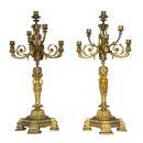 Our client's pair gilt bronze candelabra, 26 1/4 by 12 1/2 by 12 1/2 inches, are modeled after an original design by Jean-Desmosthene Dugourc (1749-1825), the important French architect and designer to the French court (including the duc d' Orleans, the brother of King Louis XVI), and date from the mid to late nineteenth century.