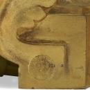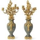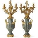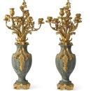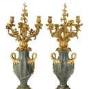 Our pair of French candelabra with six lights were designed by F. Ramaud of Paris and cast by Susse Freres in the early twentieth century. Each has an urn-form marble body mounted with ormolu acanthus leaf handles, six foliate cast branches, and a stepped plinth. Each is signed "F. Rambaud" and "Susse Fres Edtr" and stamped "SUSSE FRERES EDITEURS PARIS". One stem has the incised mark "Robert Fes Sclp". They were previously wired for electricity. We may rewire and add sockets.