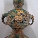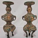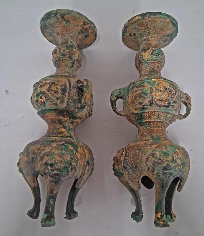Or Best OfferPair of Japanese Cast Iron Alter Candle Holders with Elephant Trunk Handles. I have also seen this type of pair being described a incense burners. They were once painted gold and green as there is still a lot of old paint still present and a light brownish coloring as well. They are decorated with raised Buddha and other motifs and they each stand on 3 legs. Dimensions: 8.5x4x4 inches each. The condition is good for age. There is no damage with the exceptoin of the worn paint.