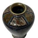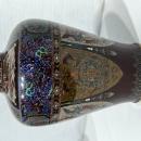 Our pair of exceptional Japanese vases from the Meiji-Taisho period, circa 1900-1920, measure 6 3/8 inches by 4 1/2 inches and feature aventurescent cloisonne designs depicting palm leaves decorated with dragons and phoenixes and friezes of flowers and geometric designs.