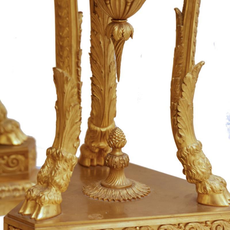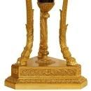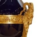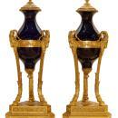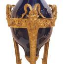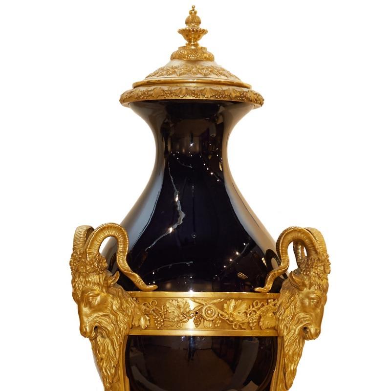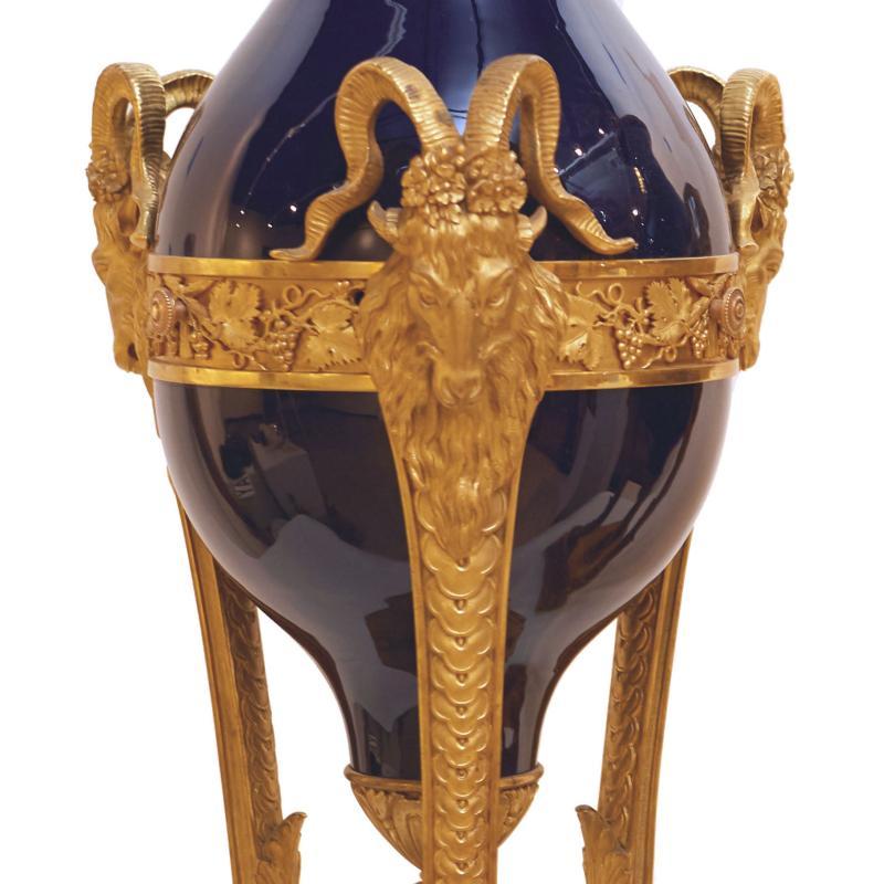 Our extraordinary pair of cassolettes in the Sevres Louis XVI style date from circa 1900, feature a cobalt blue glazed finish and are mounted in gilt bronze atheniennes decorated with ram heads, and raised on bronze legs with paw feet set upon triangular shaped bronze plinths. Apparently unsigned. 35 x 14 x 14 in; 89 x 35.5 x 35.5 cm. ( urns vases )