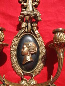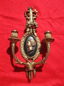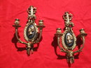 HERE IS A STUNNING PAIR OF HEAVY CAST BRONZE WALL SCONCES. THEY ARE DECORATED IN A COLONIAL/ VICTORIAN MOTIF AND FEATURE LADIES PROFILES AGAINST A BLACK BACKGROUND THERE ARE FLORAL, LEAF AND RIBBON DECORATIONS AS CAN BE SEEN IN THE IMAGES. THEY MEASURE 17" HIGH AND 9.5" WIDE. THEY HAVE A BEAUTIFUL FINISH AS CAN BE SEEN IN THE IMAGES. VERY WELL MADE AND IN EXCELLENT CONDITION. ESTIMATED WEIGHT ABOUT 5-6 LBS. EACH.