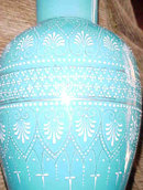 Tall and glamorous, this finely crafted glass overlay vase is a real tour de force. The underlying white glass layer lends a varied luster to the turquoise blue, rather like ancient Persian glazes. The tall-necked baluster form of the piece and the intricate palmate and dotted designs enameled on the surface, echo this appeal to Orientalism. There is a hallmark that I have not deciphered, a script letter "A" in an artist's palette. English or Continental, circa 1880. Condition is almost mint, except for some wear to the slight gilded areas. Approximately 11 inches tall by 6-1/2 inches in diameter. Very stunning.