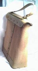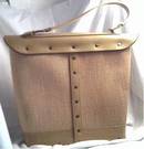 A very nice reproduction of a classic Enid Collins purse. This is not signed in any way nor is there a logo, but the style, shape, embellishments, etc. are a direct copy of an Enid Collins bag. There is no linning and no zipper inside. It has a wooden bottom. It is in good shape except for a stain on the back left side. I have tried to capture this in one of the pics. It is not bad nor is it real noticable when carrying it. It measures approx. 11" tall/approx. 13 1/2" wide at top/wooden base is approx. 4" deep/The handle adds an additional 5" to height.