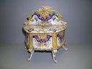 Beautifiul Covered bonbonierre in excellent condition. It is obviously designed to stand against the backboard of a buffet or similar item. It is in excellent condition with no cracks or chips. It measures 8 1/2" wide at the legs and it is 8" high. It is about 3 3/4" deep. Beautiful formal serving piece.