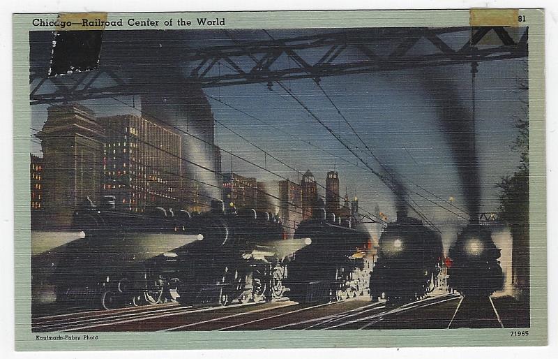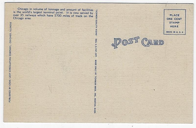 Postcard of Railroad Center of the World Chicago, Illinois. Back is unused. Postcard is in good condition, wear at edges, tape at top edge.