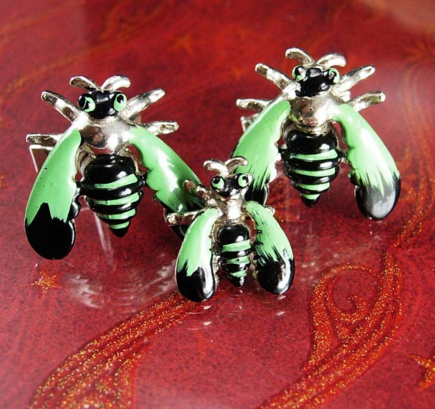 Rare Bee Cufflinks Tie tack Enamel Fly insect SWANK figural novelty gift Vintage Honey Bee lapel pin Seabee navy gift green Gardener gift