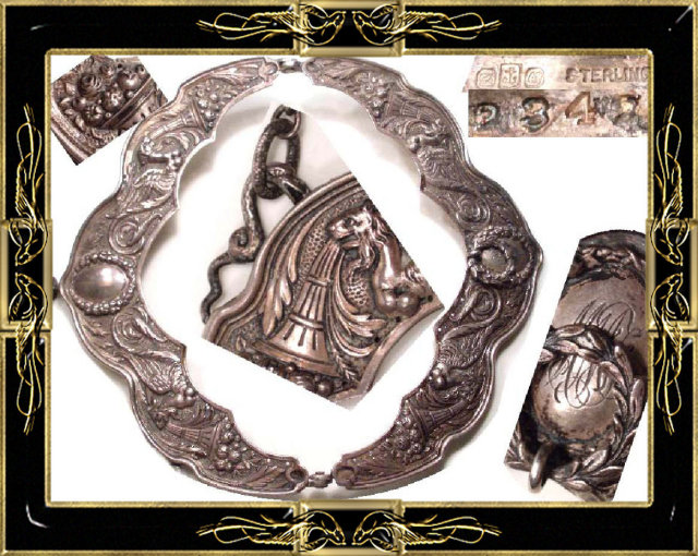 This RARE 1860s solid sterling Gorham double purse frame and florette chain is adorned with TWO serpents to hold the chain, four large griffins or winged dragon like creatures which each hold a long horn full of flowers and roses. I have never seen another like this ( and Gorham frames are VERY VERY hard to come by. Truly a specially commissioned piece that was for someone very high in society. Although Gorham is probably more well known for their flatware and serving pieces, they also produced incredibly rich and fabulous silver smalls, as well as purses and purse frames .Other than Tiffany, Gorham was THE best in silver and this one tops them all. Surely a museum piece, this has its original thick solid sterling florette chain with hand soldered thick link. Notice the loop on the front of the purse that flips up and down to hold a chatelaine. The closure works well and the it has a fancy button push in clasp. This is not small by any means and would have probably had a black fine French silk bottom. The measurements are 6 ¾ from outer hinge to outer hinge. 4 from the top of the button clap to the lowest point on the frame. Almost ½ wide and with a chain that is 17 long and 1/3 wide, this is an IMPRESSIVE PIECE! Notice the raised relief on the lip of the top of the frame. ( I have more photos if you want to email me for them) No place on this was left untouched. Even better than the photos this HIGH QUALITY antique purse is a MUST for handbag collectors as well as Gorham sterling collectors. Inside the marks are an lion, an anchor and a G. Using the Gorham hallmark index, this dates 1863-1890. IT hardly needs any polishing and since it is quite a wonderful mythological piece of art as well as a FANTASTIC purse frame, this is one of kind that needs to be in a home where it will really be treasured! This one will require insurance when shipped in the US.