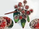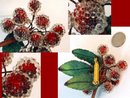 So unusual are these red beads with bubble glass beads that cling to them! When you see this in the light they appear to have an aura around them! The leaves are tipped with a darkened color to make them appear to have aged. This is probably from the 40-50's. The whole brooch measures 3" long. In good condition with very few missing clear baubles.! A real treat for vintage costume jewelry collectors!!Sold as found (used and vintage). Since this is Irreplaceable there can be no returns on this sale.