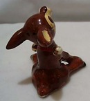 Reindeer salt shaker. This is an older ceramic reindeer shaker probably from the 1940's or 1950's. The deer is sitting down and looking very stubborn about moving!! It is brown with a cream color on ears, and front of face and body. It has a red strap with 3 bells around the neck. Aprox 2 1/2"h x 2 3/4. Very Cute!