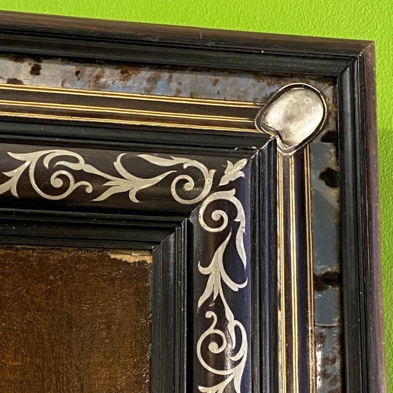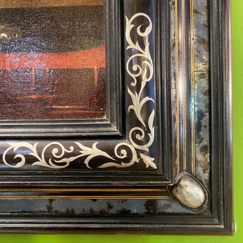 It has an extraordinary, later ebonized sgraffito frame with inlaid mother of pearl and silver or pewter mounts. Apparently unsigned. Professionally relined and mounted on keyed stretcher, apparently in the past decade or two. Unsigned.
