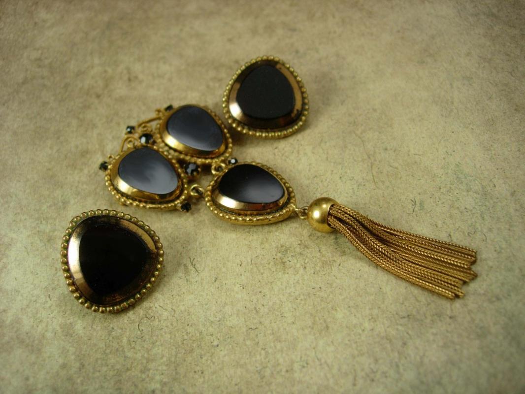 Truly a fabulous demi parure with rich golden colors and black glass stones and smaller rhinestones. All pieces on this are signed ( see photo) Very victorian in style this long ( 4 1/2") tassel brooch is highly detailed and well made. The earrings are clip and they have same gold edged matching black glass stones. It is quite the set and I have never seen another like it. The back clips on the earrings need a little cleaning.. they have a little green ( see photo). not corrosion. Very light gold wear on the edges of the stones. Sold as found. VintageSparkles offers Layaway on all our pieces regardless of which site it comes from.All layaway payments will need to be in the form of a check or money order only. Please remember that vintage & antique items are not mint, nor are they perfect but they sure are full of old history and charm. Please use photos to make your decisions and read our policies prior to buying so you can have an excellent experience with us. Please use this number when ordering ga3188bab If you want to see more of these pretties this is the link to my etsy store. http://www.vintagesparkles.etsy.com/ or visit our gallery on pinterest where you can see all our pieces at once http://pinterest.com/etsyvsparkles/sparkles-in-my-etsy-store/ http://therealvintagesparkles.tumblr.com/ https://www.facebook.com/vintagesparkless https://plus.google.com/u/0/102556096447338755912/posts/p/pub