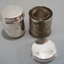 Rockford Silver Co Candle set. Unusual pair of large candle holder held in their individual silver container, cap just pops on (not threaded). One of the cases is discolored, they have been used heavily. The candle holders will hold a 1 3/4"" candle and are 2 1/4"" tall.