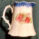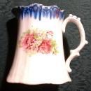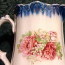 Antique rose decaled pitcher with cobalt blue and gold trim around the top rim. Stands 5 3/8" high. Has a hard-to-read green mark on the bottom that reads "Freiburg", a town in Germany. Made around the turn-of-the-century, and in very nice condition, with no chips or cracks. Inglenook Antiques...Established 1989.