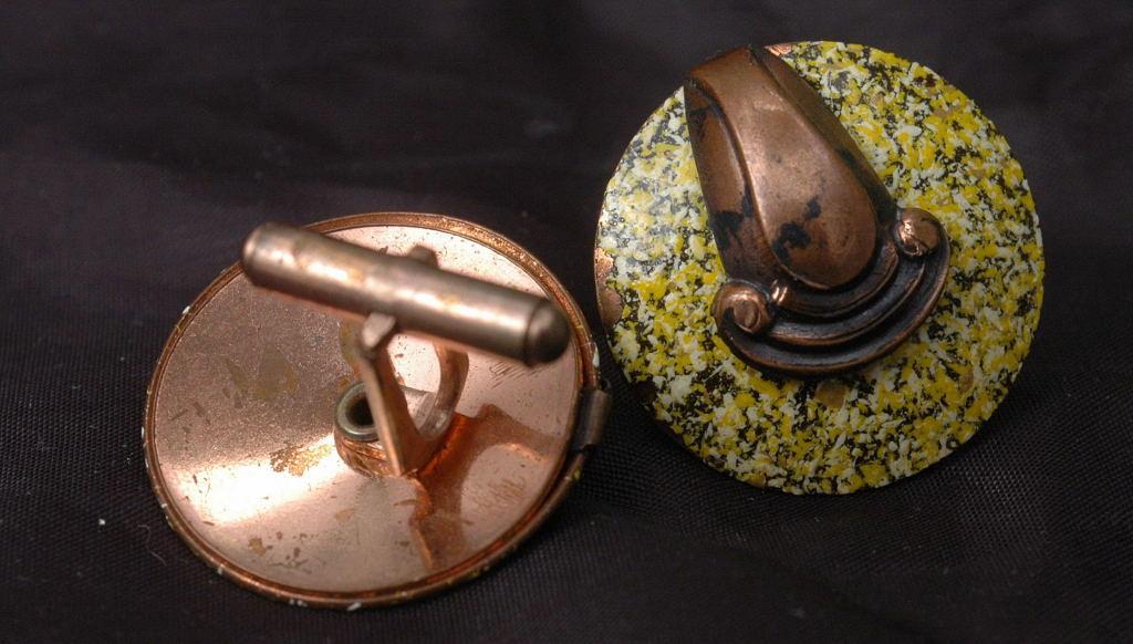 Art Deco Enamel Over Copper Cufflinks . They have yellow speckled enameling and a decidedly Art Deco adornment attached. The diameter is just over 1 inch. They are unsigned. The condition is good . The copper is tarnished and there is some enameling that has chipped off one of them near the outer edge.