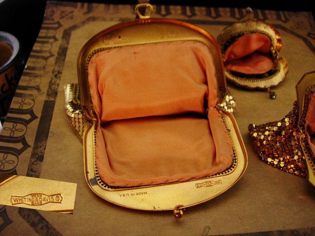 Art deco Gold Flapper purse lot / vintage Whiting & Davis mesh purse / gold bag clutch pink silk lining
