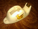 Fleeing hen chicken & running rooster colorful glazed pottery tape dispenser 1950's era wall decoration household tool.