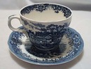Salem China English Village Cup and Saucer is blue and white with scalloped edges and a wonderful border of flowers. The center picture shows a home with trees and a bridge over water with a woman feeding the ducks. Has grassy mounds with flowers and a cloudy sky. The backstamp in blue ink shows pattern picture and reads English Village by Salem China Co. Olde Staffordshire. Finest english ironstone hand engraved underglaze. Permanent colour Salem England. The cup is 4 1/2" w/handle and is 3 1/2" high and the saucer is 5 1/2". The cup is in mint condition and the saucer is near mint.