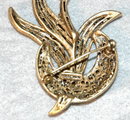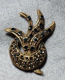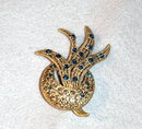 Lovely brooch of sapphire rhinestones in a spray of leaves coming from behind a crescent shape encrusted with amber colored rhinestones. The back is marked Silver Starr. It measures 2 x 2.